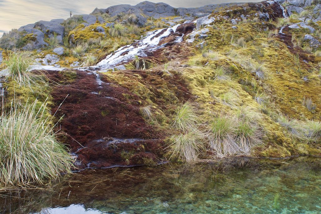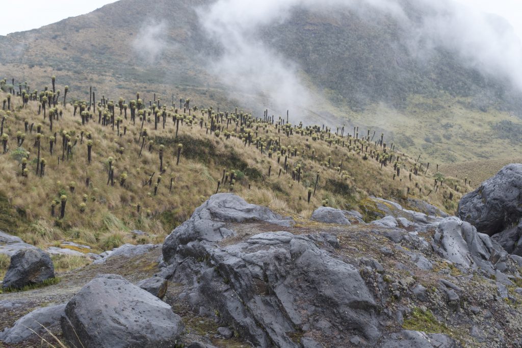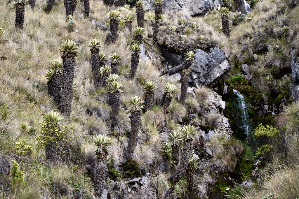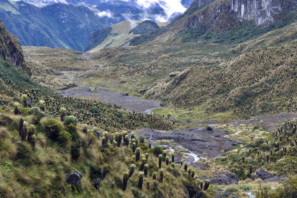 A las dos o tres curvas ciegas de haber pasado la entrada, empezamos a ver grupos de ejemplares altísimos y robustos de Espeletia hartwegiana subsp. centroandina, localmente conocidos como frailejones. Envueltos en la neblina parecían siluetas de monjes con gruesos hábitos. Estos notables miembros de la familia de los girasoles (Asteraceae) dominan los paisajes por encima del límite arbóreo en los Andes del norte. Conforme avanzamos, el terreno pasó de suaves lomas a profundos barrancos, atravesados por escorrentías y cascadas alimentadas por el deshielo.