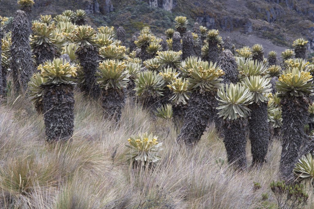 Dos o tres curvas ciegas de haber pasado la entrada, empezamos a ver grupos de ejemplares altísimos y robustos de Espeletia hartwegiana subsp. centroandina, localmente conocidos como frailejones.
